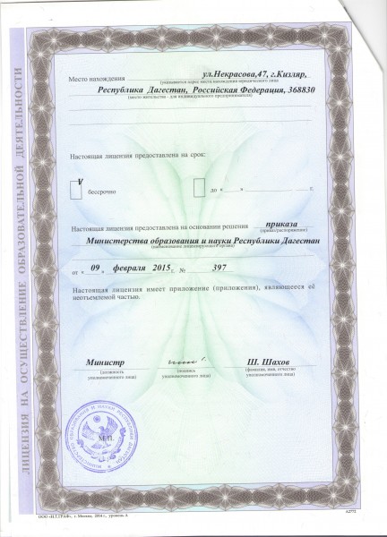 | Адрес местонахождения образовательной организации* | 368830 Республика Дагестан, г.Кизляр ул Некрасова 47 |