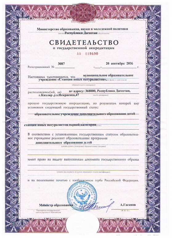 | Полное наименование образовательной организации* | Муниципальное бюджетное учреждение дополнительного образования "Станция юных натуралистов" г.Кизляр |